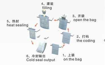 六工位工作流程: 1、传袋、取袋 2、日期打码 3、开袋 4、灌装5、封口 6、冷却、成品输出 运行示意图: ![]() |